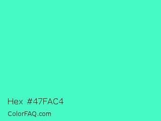 Hex #47fac4 Color is a light green color and the nearest color is Turquoise #40e0d0. Hex code #47fac4 and RGB value is rgb(71,250,196). In RGB color space, this color is composed of 28% red, 98% green, 77% blue, In CMYK color space, this color is composed of 72% cyan, 0% magenta, 22% yellow , 2% black , In HSL color space, this color has a hue angle of 162° , 95% saturation and 63% lightness.