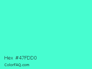 Hex #47fdd0 Color is a light cyan color and the nearest color is Turquoise #40e0d0. Hex code #47fdd0 and RGB value is rgb(71,253,208). In RGB color space, this color is composed of 28% red, 99% green, 82% blue, In CMYK color space, this color is composed of 72% cyan, 0% magenta, 18% yellow , 1% black , In HSL color space, this color has a hue angle of 165° , 98% saturation and 64% lightness.