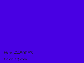 Hex #4800e3 Color is a normal indigo color and the nearest color is Electric Ultramarine #3f00ff. Hex code #4800e3 and RGB value is rgb(72,0,227). In RGB color space, this color is composed of 28% red, 0% green, 89% blue, In CMYK color space, this color is composed of 68% cyan, 100% magenta, 0% yellow , 11% black , In HSL color space, this color has a hue angle of 259° , 100% saturation and 45% lightness.