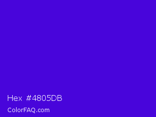 Hex #4805db Color is a normal indigo color and the nearest color is Interdimensional Blue #360ccc. Hex code #4805db and RGB value is rgb(72,5,219). In RGB color space, this color is composed of 28% red, 2% green, 86% blue, In CMYK color space, this color is composed of 67% cyan, 98% magenta, 0% yellow , 14% black , In HSL color space, this color has a hue angle of 259° , 96% saturation and 44% lightness.
