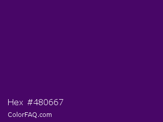 Hex #480667 Color is a very dark purple color and the nearest color is Clairvoyant #480656. Hex code #480667 and RGB value is rgb(72,6,103). In RGB color space, this color is composed of 28% red, 2% green, 40% blue, In CMYK color space, this color is composed of 30% cyan, 94% magenta, 0% yellow , 60% black , In HSL color space, this color has a hue angle of 281° , 89% saturation and 21% lightness.