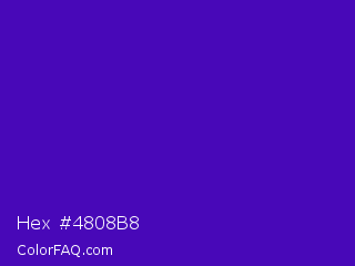 Hex #4808b8 Color is a normal violet color and the nearest color is Interdimensional Blue #360ccc. Hex code #4808b8 and RGB value is rgb(72,8,184). In RGB color space, this color is composed of 28% red, 3% green, 72% blue, In CMYK color space, this color is composed of 61% cyan, 96% magenta, 0% yellow , 28% black , In HSL color space, this color has a hue angle of 262° , 92% saturation and 38% lightness.