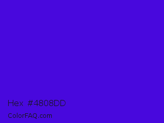 Hex #4808dd Color is a normal indigo color and the nearest color is Interdimensional Blue #360ccc. Hex code #4808dd and RGB value is rgb(72,8,221). In RGB color space, this color is composed of 28% red, 3% green, 87% blue, In CMYK color space, this color is composed of 67% cyan, 96% magenta, 0% yellow , 13% black , In HSL color space, this color has a hue angle of 258° , 93% saturation and 45% lightness.