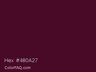 Hex #480a27 Color is a very dark rose color and the nearest color is Barossa #44012d. Hex code #480a27 and RGB value is rgb(72,10,39). In RGB color space, this color is composed of 28% red, 4% green, 15% blue, In CMYK color space, this color is composed of 0% cyan, 86% magenta, 46% yellow , 72% black , In HSL color space, this color has a hue angle of 332° , 76% saturation and 16% lightness.