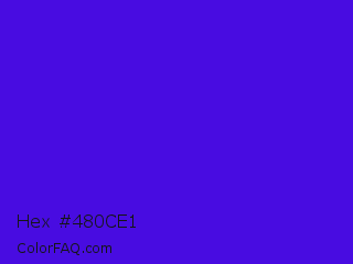 Hex #480ce1 Color is a normal indigo color and the nearest color is Interdimensional Blue #360ccc. Hex code #480ce1 and RGB value is rgb(72,12,225). In RGB color space, this color is composed of 28% red, 5% green, 88% blue, In CMYK color space, this color is composed of 68% cyan, 95% magenta, 0% yellow , 12% black , In HSL color space, this color has a hue angle of 257° , 90% saturation and 46% lightness.