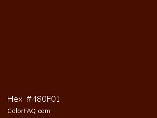 Hex #480f01 Color is a very dark red color and the nearest color is Bulgarian Rose #480607. Hex code #480f01 and RGB value is rgb(72,15,1). In RGB color space, this color is composed of 28% red, 6% green, 0% blue, In CMYK color space, this color is composed of 0% cyan, 79% magenta, 99% yellow , 72% black , In HSL color space, this color has a hue angle of 12° , 97% saturation and 14% lightness.