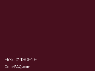 Hex #480f1e Color is a very dark rose color and the nearest color is Cab Sav #4d0a18. Hex code #480f1e and RGB value is rgb(72,15,30). In RGB color space, this color is composed of 28% red, 6% green, 12% blue, In CMYK color space, this color is composed of 0% cyan, 79% magenta, 58% yellow , 72% black , In HSL color space, this color has a hue angle of 344° , 66% saturation and 17% lightness.