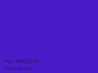 Hex #481dc8 Color is a normal indigo color and the nearest color is Interdimensional Blue #360ccc. Hex code #481dc8 and RGB value is rgb(72,29,200). In RGB color space, this color is composed of 28% red, 11% green, 78% blue, In CMYK color space, this color is composed of 64% cyan, 86% magenta, 0% yellow , 22% black , In HSL color space, this color has a hue angle of 255° , 75% saturation and 45% lightness.