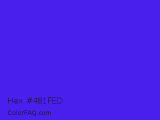 Hex #481fed Color is a normal indigo color and the nearest color is Han Purple #5218fa. Hex code #481fed and RGB value is rgb(72,31,237). In RGB color space, this color is composed of 28% red, 12% green, 93% blue, In CMYK color space, this color is composed of 70% cyan, 87% magenta, 0% yellow , 7% black , In HSL color space, this color has a hue angle of 252° , 85% saturation and 53% lightness.