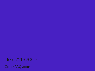 Hex #4820c3 Color is a normal indigo color and the nearest color is Interdimensional Blue #360ccc. Hex code #4820c3 and RGB value is rgb(72,32,195). In RGB color space, this color is composed of 28% red, 13% green, 76% blue, In CMYK color space, this color is composed of 63% cyan, 84% magenta, 0% yellow , 24% black , In HSL color space, this color has a hue angle of 255° , 72% saturation and 45% lightness.