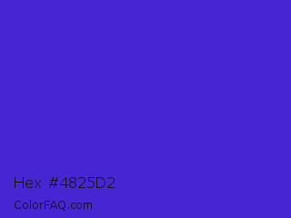 Hex #4825d2 Color is a normal indigo color and the nearest color is Interdimensional Blue #360ccc. Hex code #4825d2 and RGB value is rgb(72,37,210). In RGB color space, this color is composed of 28% red, 15% green, 82% blue, In CMYK color space, this color is composed of 66% cyan, 82% magenta, 0% yellow , 18% black , In HSL color space, this color has a hue angle of 252° , 70% saturation and 48% lightness.