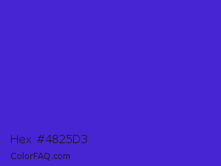 Hex #4825d3 Color is a normal indigo color and the nearest color is Interdimensional Blue #360ccc. Hex code #4825d3 and RGB value is rgb(72,37,211). In RGB color space, this color is composed of 28% red, 15% green, 83% blue, In CMYK color space, this color is composed of 66% cyan, 82% magenta, 0% yellow , 17% black , In HSL color space, this color has a hue angle of 252° , 70% saturation and 49% lightness.