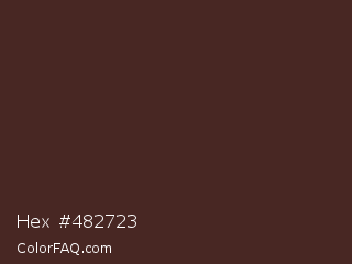 Hex #482723 Color is a very dark red color and the nearest color is Crater Brown #462425. Hex code #482723 and RGB value is rgb(72,39,35). In RGB color space, this color is composed of 28% red, 15% green, 14% blue, In CMYK color space, this color is composed of 0% cyan, 46% magenta, 51% yellow , 72% black , In HSL color space, this color has a hue angle of 6° , 35% saturation and 21% lightness.