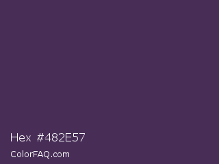 Hex #482e57 Color is a dark purple color and the nearest color is Bossanova #4e2a5a. Hex code #482e57 and RGB value is rgb(72,46,87). In RGB color space, this color is composed of 28% red, 18% green, 34% blue, In CMYK color space, this color is composed of 17% cyan, 47% magenta, 0% yellow , 66% black , In HSL color space, this color has a hue angle of 278° , 31% saturation and 26% lightness.