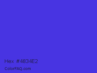 Hex #4834e2 Color is a normal indigo color and the nearest color is Palatinate Blue #273be2. Hex code #4834e2 and RGB value is rgb(72,52,226). In RGB color space, this color is composed of 28% red, 20% green, 89% blue, In CMYK color space, this color is composed of 68% cyan, 77% magenta, 0% yellow , 11% black , In HSL color space, this color has a hue angle of 247° , 75% saturation and 55% lightness.
