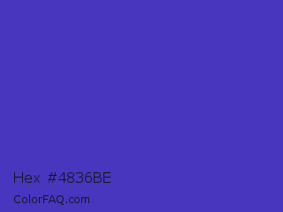 Hex #4836be Color is a normal indigo color and the nearest color is Ocean Blue #4f42b5. Hex code #4836be and RGB value is rgb(72,54,190). In RGB color space, this color is composed of 28% red, 21% green, 75% blue, In CMYK color space, this color is composed of 62% cyan, 72% magenta, 0% yellow , 25% black , In HSL color space, this color has a hue angle of 248° , 56% saturation and 48% lightness.