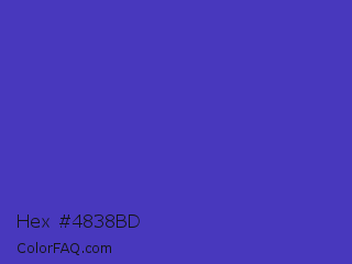Hex #4838bd Color is a normal indigo color and the nearest color is Ocean Blue #4f42b5. Hex code #4838bd and RGB value is rgb(72,56,189). In RGB color space, this color is composed of 28% red, 22% green, 74% blue, In CMYK color space, this color is composed of 62% cyan, 70% magenta, 0% yellow , 26% black , In HSL color space, this color has a hue angle of 247° , 54% saturation and 48% lightness.