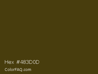 Hex #483d0d Color is a very dark yellow color and the nearest color is Bronzetone #4d400f. Hex code #483d0d and RGB value is rgb(72,61,13). In RGB color space, this color is composed of 28% red, 24% green, 5% blue, In CMYK color space, this color is composed of 0% cyan, 15% magenta, 82% yellow , 72% black , In HSL color space, this color has a hue angle of 49° , 69% saturation and 17% lightness.