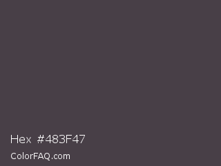 Hex #483f47 Color is a dark magenta color and the nearest color is Tundora #4a4244. Hex code #483f47 and RGB value is rgb(72,63,71). In RGB color space, this color is composed of 28% red, 25% green, 28% blue, In CMYK color space, this color is composed of 0% cyan, 13% magenta, 1% yellow , 72% black , In HSL color space, this color has a hue angle of 307° , 7% saturation and 26% lightness.