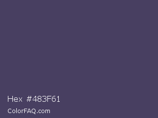Hex #483f61 Color is a normal indigo color and the nearest color is Mulled Wine #4e4562. Hex code #483f61 and RGB value is rgb(72,63,97). In RGB color space, this color is composed of 28% red, 25% green, 38% blue, In CMYK color space, this color is composed of 26% cyan, 35% magenta, 0% yellow , 62% black , In HSL color space, this color has a hue angle of 256° , 21% saturation and 31% lightness.