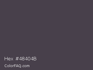 Hex #48404b Color is a dark purple color and the nearest color is Gravel #4a444b. Hex code #48404b and RGB value is rgb(72,64,75). In RGB color space, this color is composed of 28% red, 25% green, 29% blue, In CMYK color space, this color is composed of 4% cyan, 15% magenta, 0% yellow , 71% black , In HSL color space, this color has a hue angle of 284° , 8% saturation and 27% lightness.