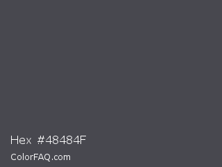Hex #48484f Color is a dark blue color and the nearest color is Gravel #4a444b. Hex code #48484f and RGB value is rgb(72,72,79). In RGB color space, this color is composed of 28% red, 28% green, 31% blue, In CMYK color space, this color is composed of 9% cyan, 9% magenta, 0% yellow , 69% black , In HSL color space, this color has a hue angle of 240° , 5% saturation and 30% lightness.