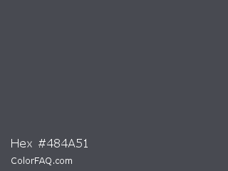 Hex #484a51 Color is a dark blue color and the nearest color is Mako #444954. Hex code #484a51 and RGB value is rgb(72,74,81). In RGB color space, this color is composed of 28% red, 29% green, 32% blue, In CMYK color space, this color is composed of 11% cyan, 9% magenta, 0% yellow , 68% black , In HSL color space, this color has a hue angle of 227° , 6% saturation and 30% lightness.