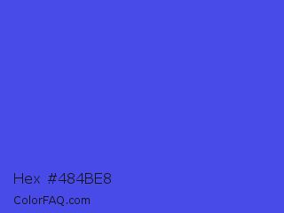 Hex #484be8 Color is a normal blue color and the nearest color is Majorelle Blue #6050dc. Hex code #484be8 and RGB value is rgb(72,75,232). In RGB color space, this color is composed of 28% red, 29% green, 91% blue, In CMYK color space, this color is composed of 69% cyan, 68% magenta, 0% yellow , 9% black , In HSL color space, this color has a hue angle of 239° , 78% saturation and 60% lightness.