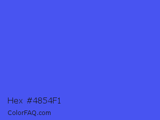 Hex #4854f1 Color is a light blue color and the nearest color is Ultramarine Blue #4166f5. Hex code #4854f1 and RGB value is rgb(72,84,241). In RGB color space, this color is composed of 28% red, 33% green, 95% blue, In CMYK color space, this color is composed of 70% cyan, 65% magenta, 0% yellow , 5% black , In HSL color space, this color has a hue angle of 236° , 86% saturation and 61% lightness.