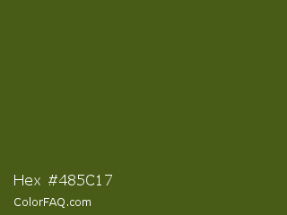 Hex #485c17 Color is a dark lime color and the nearest color is Dark Moss Green #4a5d23. Hex code #485c17 and RGB value is rgb(72,92,23). In RGB color space, this color is composed of 28% red, 36% green, 9% blue, In CMYK color space, this color is composed of 22% cyan, 0% magenta, 75% yellow , 64% black , In HSL color space, this color has a hue angle of 77° , 60% saturation and 23% lightness.