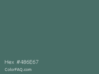 Hex #486e67 Color is a normal cyan color and the nearest color is Stormcloud #4f666a. Hex code #486e67 and RGB value is rgb(72,110,103). In RGB color space, this color is composed of 28% red, 43% green, 40% blue, In CMYK color space, this color is composed of 35% cyan, 0% magenta, 6% yellow , 57% black , In HSL color space, this color has a hue angle of 169° , 21% saturation and 36% lightness.