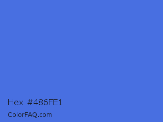 Hex #486fe1 Color is a normal blue color and the nearest color is Royal Blue #4169e1. Hex code #486fe1 and RGB value is rgb(72,111,225). In RGB color space, this color is composed of 28% red, 44% green, 88% blue, In CMYK color space, this color is composed of 68% cyan, 51% magenta, 0% yellow , 12% black , In HSL color space, this color has a hue angle of 225° , 72% saturation and 58% lightness.