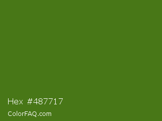 Hex #487717 Color is a dark green color and the nearest color is Green Leaf #436a0d. Hex code #487717 and RGB value is rgb(72,119,23). In RGB color space, this color is composed of 28% red, 47% green, 9% blue, In CMYK color space, this color is composed of 39% cyan, 0% magenta, 81% yellow , 53% black , In HSL color space, this color has a hue angle of 89° , 68% saturation and 28% lightness.