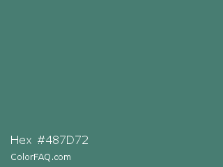 Hex #487d72 Color is a normal cyan color and the nearest color is Hookers Green #49796b. Hex code #487d72 and RGB value is rgb(72,125,114). In RGB color space, this color is composed of 28% red, 49% green, 45% blue, In CMYK color space, this color is composed of 42% cyan, 0% magenta, 9% yellow , 51% black , In HSL color space, this color has a hue angle of 168° , 27% saturation and 39% lightness.
