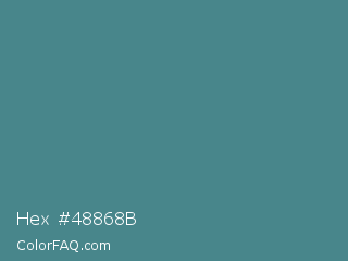 Hex #48868b Color is a normal cyan color and the nearest color is Smalt Blue #51808f. Hex code #48868b and RGB value is rgb(72,134,139). In RGB color space, this color is composed of 28% red, 53% green, 55% blue, In CMYK color space, this color is composed of 48% cyan, 4% magenta, 0% yellow , 45% black , In HSL color space, this color has a hue angle of 184° , 32% saturation and 41% lightness.