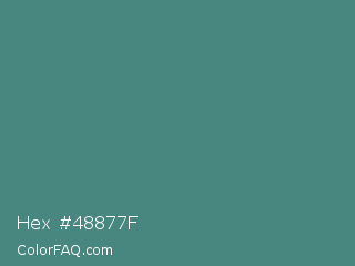 Hex #48877f Color is a normal cyan color and the nearest color is Wintergreen Dream #56887d. Hex code #48877f and RGB value is rgb(72,135,127). In RGB color space, this color is composed of 28% red, 53% green, 50% blue, In CMYK color space, this color is composed of 47% cyan, 0% magenta, 6% yellow , 47% black , In HSL color space, this color has a hue angle of 172° , 30% saturation and 41% lightness.