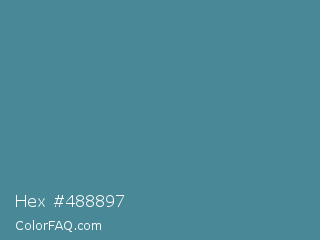 Hex #488897 Color is a normal cyan color and the nearest color is Wedgewood #4e7f9e. Hex code #488897 and RGB value is rgb(72,136,151). In RGB color space, this color is composed of 28% red, 53% green, 59% blue, In CMYK color space, this color is composed of 52% cyan, 10% magenta, 0% yellow , 41% black , In HSL color space, this color has a hue angle of 191° , 35% saturation and 44% lightness.