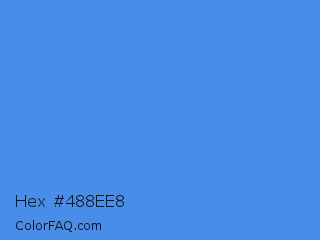 Hex #488ee8 Color is a normal blue color and the nearest color is Tufts Blue #3e8ede. Hex code #488ee8 and RGB value is rgb(72,142,232). In RGB color space, this color is composed of 28% red, 56% green, 91% blue, In CMYK color space, this color is composed of 69% cyan, 39% magenta, 0% yellow , 9% black , In HSL color space, this color has a hue angle of 214° , 78% saturation and 60% lightness.