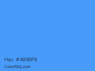 Hex #489bf8 Color is a light blue color and the nearest color is Blueberry #4f86f7. Hex code #489bf8 and RGB value is rgb(72,155,248). In RGB color space, this color is composed of 28% red, 61% green, 97% blue, In CMYK color space, this color is composed of 71% cyan, 38% magenta, 0% yellow , 3% black , In HSL color space, this color has a hue angle of 212° , 93% saturation and 63% lightness.