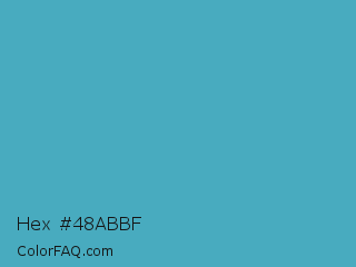 Hex #48abbf Color is a normal cyan color and the nearest color is Pelorous #3eabbf. Hex code #48abbf and RGB value is rgb(72,171,191). In RGB color space, this color is composed of 28% red, 67% green, 75% blue, In CMYK color space, this color is composed of 62% cyan, 10% magenta, 0% yellow , 25% black , In HSL color space, this color has a hue angle of 190° , 48% saturation and 52% lightness.