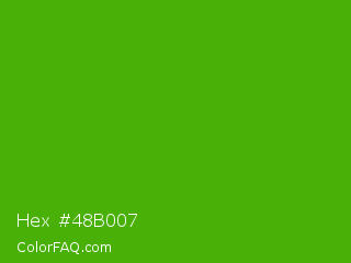 Hex #48b007 Color is a normal green color and the nearest color is Kelly Green #4cbb17. Hex code #48b007 and RGB value is rgb(72,176,7). In RGB color space, this color is composed of 28% red, 69% green, 3% blue, In CMYK color space, this color is composed of 59% cyan, 0% magenta, 96% yellow , 31% black , In HSL color space, this color has a hue angle of 97° , 92% saturation and 36% lightness.