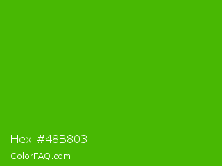 Hex #48b803 Color is a normal green color and the nearest color is Kelly Green #4cbb17. Hex code #48b803 and RGB value is rgb(72,184,3). In RGB color space, this color is composed of 28% red, 72% green, 1% blue, In CMYK color space, this color is composed of 61% cyan, 0% magenta, 98% yellow , 28% black , In HSL color space, this color has a hue angle of 97° , 97% saturation and 37% lightness.