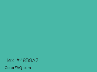 Hex #48b8a7 Color is a normal cyan color and the nearest color is Verdigris #43b3ae. Hex code #48b8a7 and RGB value is rgb(72,184,167). In RGB color space, this color is composed of 28% red, 72% green, 65% blue, In CMYK color space, this color is composed of 61% cyan, 0% magenta, 9% yellow , 28% black , In HSL color space, this color has a hue angle of 171° , 44% saturation and 50% lightness.