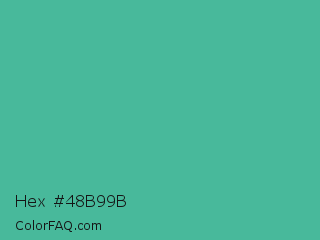 Hex #48b99b Color is a normal cyan color and the nearest color is Ocean Green #48bf91. Hex code #48b99b and RGB value is rgb(72,185,155). In RGB color space, this color is composed of 28% red, 73% green, 61% blue, In CMYK color space, this color is composed of 61% cyan, 0% magenta, 16% yellow , 27% black , In HSL color space, this color has a hue angle of 164° , 45% saturation and 50% lightness.