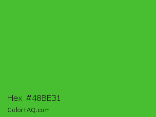 Hex #48be31 Color is a normal green color and the nearest color is Wageningen Green #34b233. Hex code #48be31 and RGB value is rgb(72,190,49). In RGB color space, this color is composed of 28% red, 75% green, 19% blue, In CMYK color space, this color is composed of 62% cyan, 0% magenta, 74% yellow , 25% black , In HSL color space, this color has a hue angle of 110° , 59% saturation and 47% lightness.