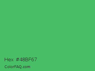 Hex #48bf67 Color is a normal green color and the nearest color is Medium Sea Green #3cb371. Hex code #48bf67 and RGB value is rgb(72,191,103). In RGB color space, this color is composed of 28% red, 75% green, 40% blue, In CMYK color space, this color is composed of 62% cyan, 0% magenta, 46% yellow , 25% black , In HSL color space, this color has a hue angle of 136° , 48% saturation and 52% lightness.