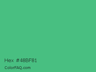 Hex #48bf81 Color is a normal green color and the nearest color is Emerald #50c878. Hex code #48bf81 and RGB value is rgb(72,191,129). In RGB color space, this color is composed of 28% red, 75% green, 51% blue, In CMYK color space, this color is composed of 62% cyan, 0% magenta, 32% yellow , 25% black , In HSL color space, this color has a hue angle of 149° , 48% saturation and 52% lightness.