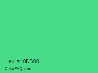 Hex #48db88 Color is a normal green color and the nearest color is Emerald #50c878. Hex code #48db88 and RGB value is rgb(72,219,136). In RGB color space, this color is composed of 28% red, 86% green, 53% blue, In CMYK color space, this color is composed of 67% cyan, 0% magenta, 38% yellow , 14% black , In HSL color space, this color has a hue angle of 146° , 67% saturation and 57% lightness.