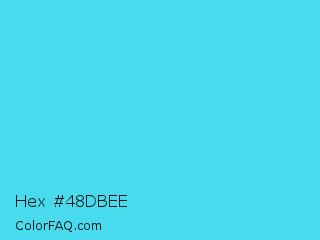 Hex #48dbee Color is a light cyan color and the nearest color is Turquoise #40e0d0. Hex code #48dbee and RGB value is rgb(72,219,238). In RGB color space, this color is composed of 28% red, 86% green, 93% blue, In CMYK color space, this color is composed of 70% cyan, 8% magenta, 0% yellow , 7% black , In HSL color space, this color has a hue angle of 187° , 83% saturation and 61% lightness.