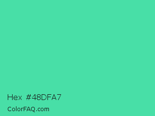 Hex #48dfa7 Color is a normal green color and the nearest color is Eucalyptus #44d7a8. Hex code #48dfa7 and RGB value is rgb(72,223,167). In RGB color space, this color is composed of 28% red, 87% green, 65% blue, In CMYK color space, this color is composed of 68% cyan, 0% magenta, 25% yellow , 13% black , In HSL color space, this color has a hue angle of 158° , 70% saturation and 58% lightness.